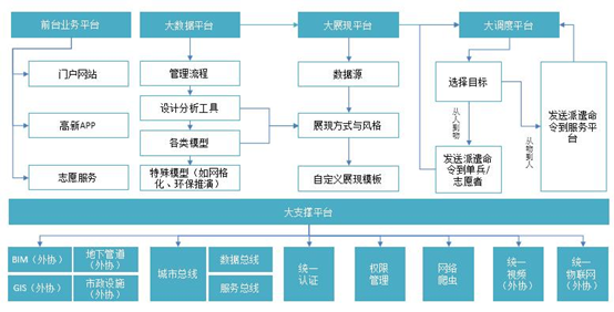 智慧城市建设按照“以城市大数据建设为核心,以平台、系统建设提质大数据效能,以网络、安全、建设保障大数据可靠”的思路规划整体建设方案,设计为大数据平台、大展现平台、大调度平台、前台业务平台和大支撑平台这5个部分。各部分的逻辑关系和总体框架如下图: