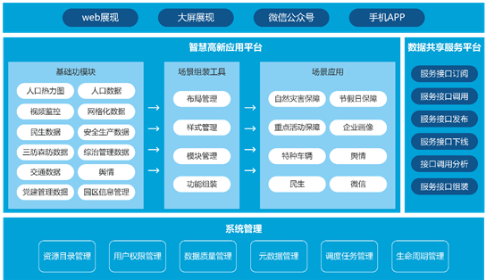 应用架构上场景驱动应用型设计,基于系统管理和基础功能模块上,搭建场景组装工具,采用场景模拟的方式驱动应用,并以数据共享服务平台集成,满足用户从Web、大屏、手机等多渠道应用。应用架构图如下: